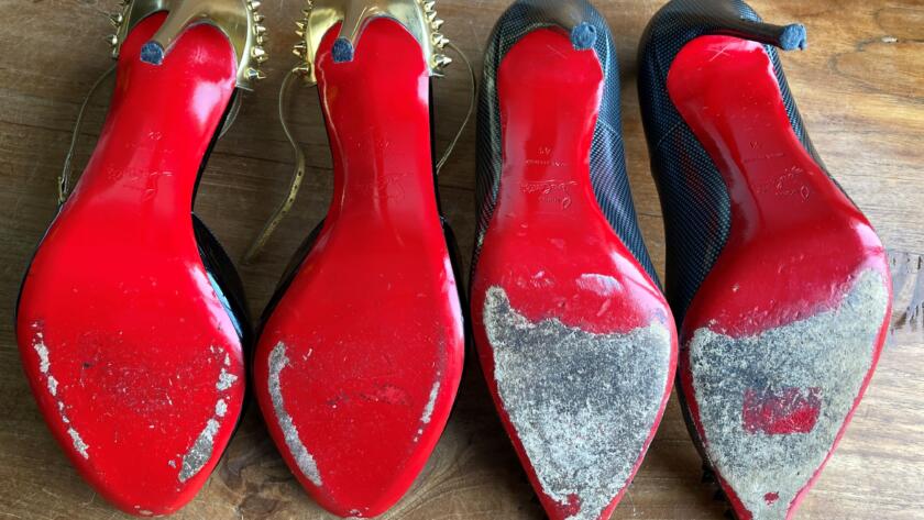Then I started working on the Louboutin heels. Most requests concerned sole restoration, a job that you can easily do at the same time. So… time for the sander! Don’t be alarmed, fortunately not all soles have to be sanded bare at the same time. Although the soles always seem very damaged after sanding, they improve very quickly once the first layer of paint is applied again. Where necessary, the sole is not only painted on request, but also filled again to make it as good as new afterwards. Whatever the customer’s wishes, the result may be impressive.